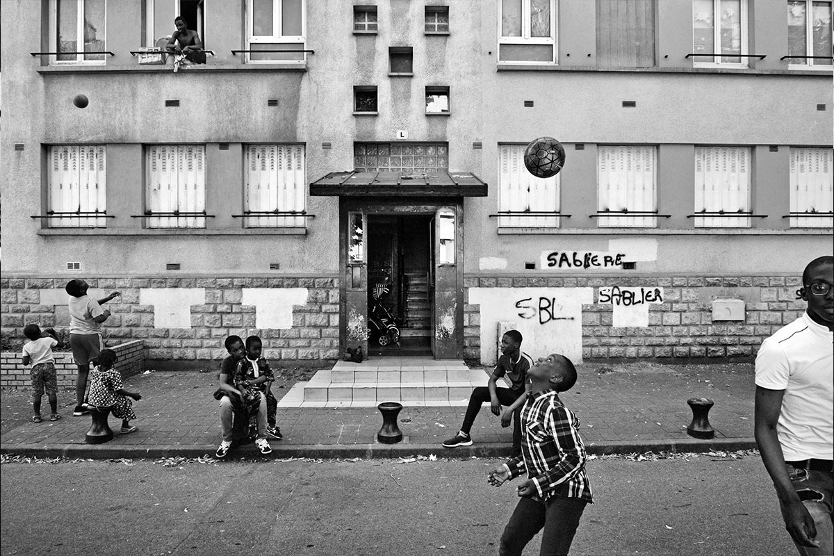 Die Sonderausstellung „La vie des blocs“ vereint rund 130 Fotografien von Jean-Michel Landon. Dieser kennt die Pariser Vororte aus erster Hand. Sein Blick auf diese Welt ist so auch im Gegensatz zur formalen Reduziertheit seiner Schwarz-Weiß-Aufnahmen vielschichtig und differenziert. 1978 in Créteil geboren, bewegt sich Landon zunächst als Jugendlicher, später als Sozialarbeiter und heute als Fotograf im Slalom zwischen den verschiedenen Stadtvierteln. „Landons Reportage gibt einen intimen Einblick und erzählt vom Alltag der Menschen im Schatten der Wohntürme: ungeschönt und ungefiltert, aber immer erfüllt von dem Respekt und der Empathie des Eingeweihten“, beschreibt Kuratorin und ZEPHYR-Leiterin Stephanie Herrmann die Arbeiten. „Landon bricht mit den oft negativen Klischees über das Leben in den Banlieues.“ So verschmelzen in den Aufnahmen harte Alltagsrealitäten — geprägt von ethnischer und sozialer Ghettoisierung, Wohnungsnot, Drogenkonsum und Perspektivlosigkeit — mit Momenten voller Unbeschwertheit, Lebensfreude und Solidarität. Seine Aufmerksamkeit richtet Landon besonders auf die Kinder und jungen Erwachsenen, die er mit sensiblem Blick porträtiert — es sind Momentaufnahmen frei von Inszenierung und Voyeurismus. „Landon ist hier durchaus in der Tradition bedeutender Vertreter der humanistischen Fotografie wie Henri Cartier-Bresson, Willy Ronis oder Robert Doisneau zu verstehen“, erklärt Herrmann. Es sind nicht die lauten Gesten und sensa-tionellen Augenblicke, die Landon festhält. Sein Interesse gilt häufig den leisen Randerscheinungen, dem Alltäglichen. ‹