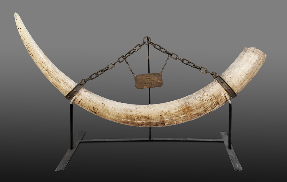 Theodor Bumiller in kolonialer Pose mit ungenannten Soldaten und Teilnehmern einer Militärexpedition in Deutsch-Ostafrika, zw. 1889-1893 / Elefantenstoßzahn als Geschenk des ostafrikanischen Sklaven- und Elfenbeinhändlers Tippu-Tip an Theodor Bumiller in der Weltkulturen-Sammlung der Reiss-Engelhonr-Museen; mit alter Ausstellungsmontage aus den 1920er/30er JahrenReiss-Engelhorn-Museen