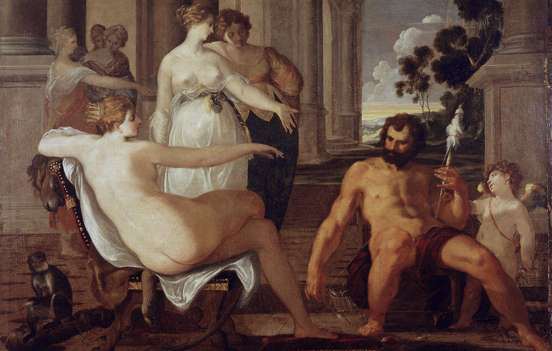 Amphore, 540 v. Chr., Schale 560 v. Chr., beides Antikenmuseum Basel und Sammlung Ludwig; Herkules-Statue, Antikensammlung Universität Heidelberg; Herkules und Amazone, Bronze, Landesmuseum Bonn; Stehender Herkules, um 1758, Johann Wilhelm Lanz, KMH; Herkules und Omphale, um 1626, Laurent de la Hyre, KMHKurpfälzisches Museum