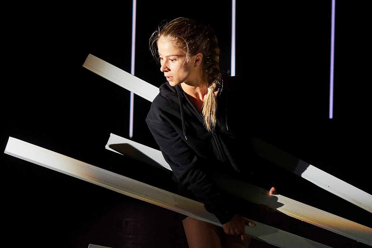 Schmerzensreich oder doch gleich gar keine Gefühle? Dieser Frage widmen sich zwei weitere Produktionen. „Stabat Mater“, inszeniert von Regisseurin Egle Kazickaite, basiert auf August Strindbergs 1907 veröffentlichtem Theaterstück „Der Pelikan“. Der Titel nimmt Bezug auf die um ihren Sohn trauernde Mutter Gottes, die „Schmerzensreiche“, und hinterfragt die Rolle der Frau als ergebene und sich aufopfernde Mutter. Die Antwort wird nicht in Worten gesucht. Der gesamte Text wird kompromisslos in Bewegung übersetzt und allein der körpersprachliche Ausdruck macht die Beziehungen zwischen den Figuren deutlich. Camus und StrindbergEbenfalls Anleihe bei einem europäischen Klassiker, diesmal bei Albert Camus’ existenzialistischem Roman „Der Fremde“, nimmt Regisseur Agnius Jankevicius mit „Mari Kardona“. Er lässt die Nebenfigur Marie Cardona aus dem Schatten des Protagonisten Meursault hervortreten und das erzählen, was Camus nicht geschrieben hat: Ihre eigene Lebensgeschichte, denn sie hat nie gelernt zu fühlen. Sie muss erst begreifen, was es bedeutet, wenn sich ein eigenartiges Gefühl in der Magengrube einstellt und die Augen feucht werden. Sowohl die Schauspielerin Gabriele Ladygaite als auch Regisseur Agnius Jankevicius waren 2018 mit „Mari Kardona“ für das Goldene Kreuz, eine der höchsten litauischen Theaterauszeichnungen, nominiert.