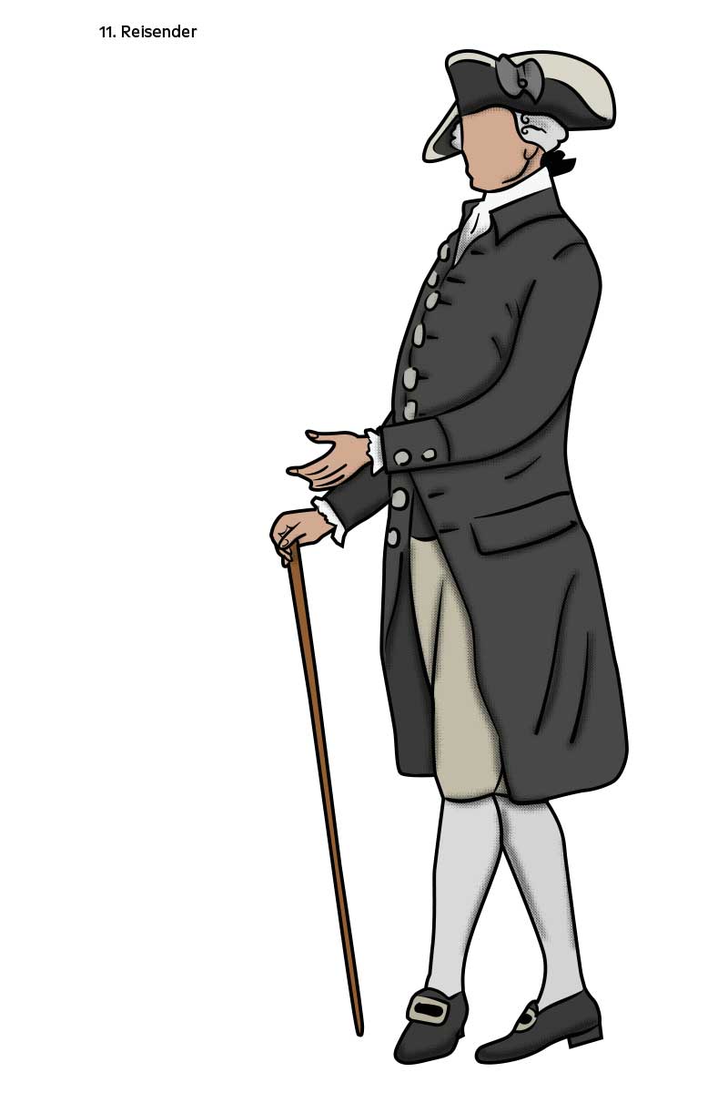 Ein elfköpfiges Recherche-Team aus dem MARCHIVUM ist in die zeitgenössischen Quellen wie Reiseberichte, Memoiren und Selbstzeugnisse, Gerichtsakten, Amtsbücher, Verordnungen sowie Forschungsliteratur über das 18. Jahrhundert eingetaucht, um die „Besetzung“ der Ausstellungsfiguren zusammenzustellen. Neben den namentlich überlieferten Personen sind auch Figuren dabei, die als Individuum nicht zurückverfolgt werden können. „Als Quellen haben wir in diesen Fällen meist nicht mehr als einen Namen, sie stehen aber repräsentativ für eine ganze Gruppe“, erklärt Throckmorton. „Es gibt zum Beispiel einen Bettler, für den es kein konkretes historisches Vorbild gibt, aber er steht für das Bettelwesen, über das in den Quellen viel überliefert ist.“ Der Glanz des kurfürstlichen Hofes zog viele wohlhabende Menschen, besondere Talente und Gelehrte an, aber auch viele geschäftstüchtige „kleine“ Leute wie Händler oder eben auch Bettler. „Sie waren dem Kurfürsten zwar ein Dorn im Auge“, so Throckmorton, „aber der Schlossplatz und die sogenannte Schlossfreiheit entzogen sie der Verfolgung durch die Stadtpolizei. Wenn es ihnen gelang, dorthin vorzudringen, konnten sie sich dort ankommenden Reisenden vor die Füße werfen und ihr Glück versuchen.“ Die Reise endet im Schloss. Abgegrenzt durch eine Wand mit einer Projektion desselben, betreten die Besucher*innen so symbolisch den Hof. Dahinter sind die Kurfürstin Elisabeth Auguste und Carl Theodor ebenfalls als Aufsteller anzutreffen. Mit der Besonderheit, dass der Kurfürst selbst nicht zu Wort kommt. „Die Besucher*innen können hier ihre eigenen Gedanken zu Carl Theodor in seiner Sprechblase ergänzen“, erklärt Throckmorton. Wer möchte, kann in die Rolle des Regenten schlüpfen, denn das kurfürstliche Haupt ist mit einer Aussparung versehen — einmal den Kopf durchgestreckt wird man zu einer der schillerndsten Figuren, die Mannheim je gesehen hat. Oder man kommt alternativ nach dieser Entdeckungsreise zu dem gleichen Schluss wie einst Boswell, der sein eingangs erwähntes Poem mit einem gar drastischen Schlusspunkt versah und klarstellte: „Für ihn scharwenzelten die Schranzen all, / Bloß ich gab zu verstehn: Du kannst mich mal —“ ‹Carl Theodors Mannheim. Die Stadt, ihre Menschen und der Kurfürst