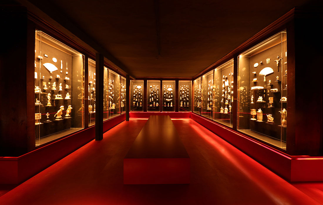 Untrennbar mit dem Elfenbein in Erbach ist der Name des Grafen Franz I. verbunden. 1754 als einziges Kind und Thronfolger geboren, stirbt sein Vater, als Franz drei Jahre alt ist. Seine Mutter und ein Onkel führen die Regentschaft, während der minderjährige Monarch beeinflusst von dem Gedankengut der Aufklärung erzogen wird. Schon im Alter von 15 Jahren zieht er in die Welt hinaus und lernt an den größten Königshöfen Europas, kommt mit den führenden Köpfen in Kontakt und bleibt mit ihnen im Austausch. Universell gebildet und von den Ideen der Aufklärung und der Romantik durchdrungen, kehrt er voller umwälzender Ideen und mit großen Sammlungen nach Erbach zurück. Seiner damals wie heute berühmten Antiken-Sammlung fügt er die Sammlung mittelalterlicher Rüstungen, die enzyklopädische Sammlung der Schusswaffen und als Lehrsammlung die Geweihsammlung hinzu. Alle Konvolute waren bereits um 1800 öffentlich zugänglich und wurden in großen Prachtkatalogen, die mit einer Fülle von Zeichnungen versehen sind, detailliert beschrieben. Weltweiter Ruhm für die „Erbacher Rose“„Sein aufgeklärtes Wissen hat Franz I. vor allem auch für soziale Reformen eingesetzt, um die Armut in seiner Grafschaft zu lindern“, erläutert Karl Weber, Direktor der Verwaltung der Staatlichen Schlösser und Gärten Hessen. Darüber hinaus schafft er neue Erwerbsmöglichkeiten. Die Töpferei — auch die Nachbildung antiker griechischer Vasen — wird schnell zugunsten der Elfenbeinschnitzerei aufgegeben. Auch wenn das Rohmaterial nicht ganz einfach zu beschaffen ist, springt der Funke der Begeisterung schnell auf die Odenwälder über. Denn Franz I. ist äußerst kunstfertig. Als erster Obermeister der neu gegründeten Zunft, spornt er die anderen an und sorgt auch für den Vertrieb. Dank seiner hervorragenden Beziehungen zu vielen europäischen Höfen entwickelt sich rasch ein blühender Handel. „Der Odenwald hatte eine neue nachhaltige Erwerbsquelle, die viele Jahrzehnte, weit über den Tod des Grafen Franz hinaus, das Arbeitsleben der Menschen prägte“, betont Weber. Wie sehr die Odenwälder ihr Handwerk verstehen, zeigt das Beispiel der „Erbacher Rose“. Sie wird auf der Weltausstellung in Wien 1873 prämiert und erlangt so weltweiten Ruhm.Ihre erste Heimat fanden die wertvollen Elfenbeinschnitzereien im Erbacher Schloss. Dieses Schatzhaus ist bis heute von den Sammlungen und dem Geist Franz I. durchdrungen. 1911 wurde eine erste Vitrine eingerichtet. Später entstand daraus ein kleines Museum, das aber im Schloss ohne festen Standort umherwanderte. 1966 wurde dann — auch auf Initiative des damals einflussreichen Grafen Franz II. — außerhalb der Innenstadt eine feste Bleibe gegründet, die sich den Namen „Deutsches Elfenbeinmuseum“ gab. Trägerin dieses Museums war die Stadt Erbach, die dessen Finanzierung sicherstellte, bis auch aus finanziellen Gründen eine Verlagerung notwendig wurde. Und so kehrten jetzt die Elfenbeinschätze ins Schloss zurück, wo sie in zuvor nicht genutzten Depoträumen untergebracht wurden. Einst befanden sich dort die Küchen und Vorratskammern. Historische Stücke, moderne Präsentation„Es war eine Herausforderung, in diesen kleinen Räumen, die in schlechtem Zustand waren, ein modernes Konzept für die Präsentation des Erbacher Elfenbeins zu finden“, versichert Weber. Die Architekten Peter Sichau und Hartmut Walter entwickelten gleichwohl eine beeindruckende Lösung. Ein 90 Meter langer Steg führt an den Vitrinen vorbei. Der sie umgebende Raum verschwindet im Dunklen, sodass die Exponate scheinbar schweben. Der Effekt: Die Objekte stehen im Vordergrund und nicht das Ensemble aus Raum und Objekten wie bei den historischen Sammlungen. Auf diese Weise gewährt das Museum einen modernen Blick auf die handwerklichen Kleinode, die Franz I. teilweise eigenhändig geschaffen hat. „Das Land Hessen hat 2005 nach einem langen sorgfältigen Abwägungsprozess entschieden, die für die Geschichte des Odenwalds so wichtigen Sammlungen hier am originalen Standort zu belassen“, erläutert Weber. Die Idee, einzelne, besonders wertvolle Werke in ein Landesmuseum zu überführen, sei bewusst verworfen worden. Zur Freude nicht nur der Odenwälder Elfenbeinschnitzer, sondern auch der vielen Besucher von Schloss Erbach. Denn so ist und bleibt das Schloss nicht nur wegen seiner idyllischen Lage eine Reise wert! ‹