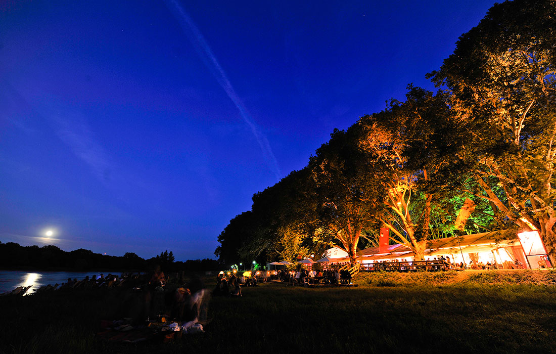 › Festivals beschleunigen die Zeit. Nicht nur weil die wenigen besonderen Tage stets viel zu schnell wieder vorbei sind, es sind auch die Jahre des Bestehens, die man so deutlich vor Augen hat — ganz so, wie wenn wieder der eigene Geburtstag vor der Tür steht. Für dieses Filmfestival ist es der zwölfte. Staunend begreift man, wie steil die Kurve nach oben geht — mit 7.000 Besuchern im Jahr 2005 und fast 90.000 im Jahr 2015 –, wie aus einem provisorisch unten am Rheinufer errichteten Besucherzelt und einem Kino oben unter den Bäumen eine ausgeklügelte Zeltlandschaft wurde, mit einer sorgfältig geplanten Infrastruktur — vom Catering über wetterfeste Wandelgänge und lichtdichte Kinozelte mit je 1.200 Sitzplätzen bis zu den Terrassen am Rhein samt perfekter Illumination.