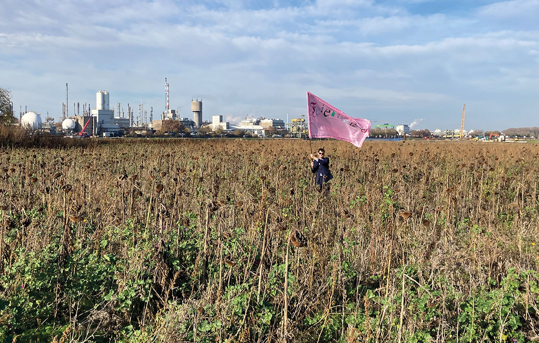 Armin Chodzinski ist auf Achse. Mit einer bunten Flagge, die der Schriftzug „Feierabend“ ziert, posiert der Hamburger Künstler an verschiedenen Orten in Ludwigshafen und Umgebung — auf dem Berliner Platz, vor dem Rheinpfalz-Hochhaus, neben der Arbeitsagentur oder auf einem Feld mit der Silhouette der BASF im Hintergrund. „Das sind Orte, die alle irgendwie mit dem Thema Feierabend zu tun haben“, erklärt Chodzinski. Die Fotografien bilden Motive einer Postkarten-Serie, die Chodzinski zum Auftakt seines Daseins als BASF-Werkskünstler verteilt hat. „Ich möchte die Leute dazu animieren, mit mir ihre Gedanken, Anekdoten und Fundstücke zum Thema zu teilen.“