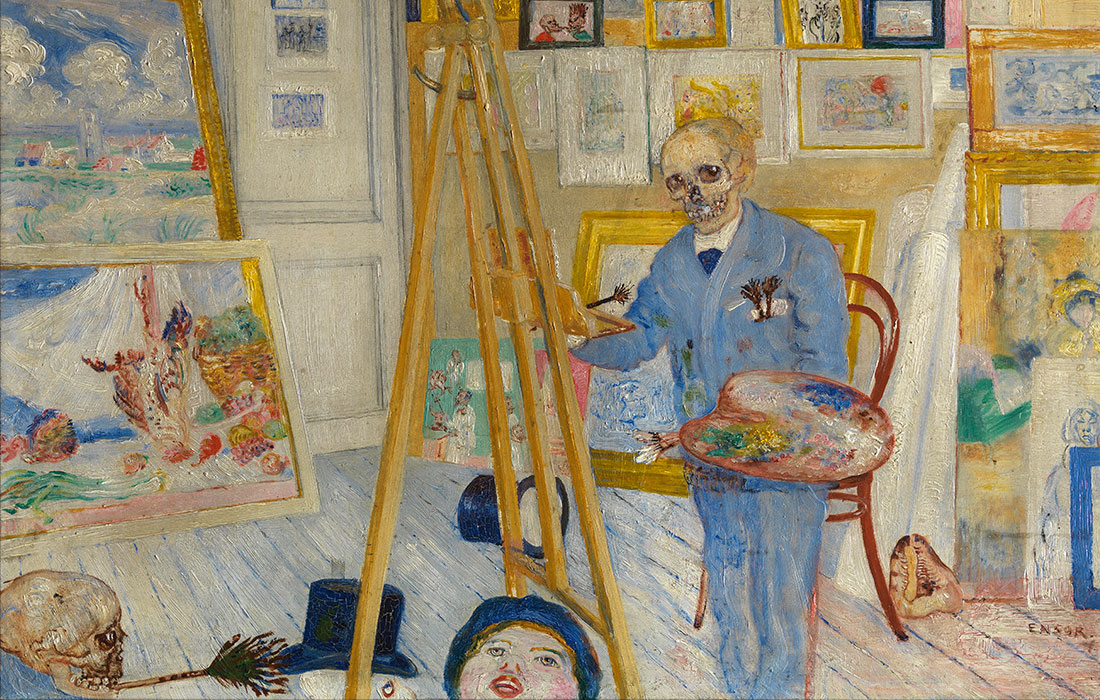 „Der Tod und die Masken“ ist eines der bedeutendsten Gemälde Ensors und wird ab Juni zusammen mit zwei weiteren Gemälden das Zentrum der Mannheimer Schau bilden. In den 1950er-Jahren erwarb die Kunsthalle als Ersatz für das beschlagnahmte Bild das Stillleben „Der tote Hahn“. Als Bild im Bild taucht dieses im berühmten Gemälde „Das malende Skelett“ auf. Um diese drei Bilder werden sich weitere internationale Leihgaben zum Motivkreis Selbstbildnis — Maske — Tod — Stillleben gruppieren, die zeigen, wie eng verflochten diese Thematik in Ensors Schaffen war.