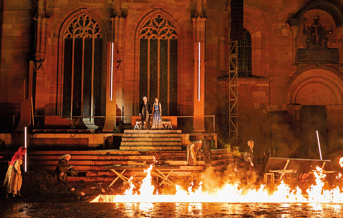 › Die Nibelungen-Festspiele zählen zu den bekanntesten Open-Air-Theaterfestivals Deutschlands. Seit 2002 stehen auf der imposanten Freilichtbühne vor dem Wormser Kaiserdom jährlich renommierte Theater- und Filmschauspieler und -schauspielerinnen. Unter der Intendanz von Nico Hofmann wird 2020 eine Uraufführung zu sehen sein. Regie führt Roger Vontobel, dessen Inszenierung „Siegfrieds Erben“ und deren technische Effekte, wie das 3D-Mapping mit den projizierten Gesichtern an den Dommauern, 2018 nicht nur die Besucher und Besucherinnen begeisterte, sondern auch die Kritik überzeugte. „Das Stück, inszeniert von Roger Vontobel, ist effektsicheres Cinemascope-Theater mit viel Video- und Pyrotechnik“, schrieb beispielsweise die Süddeutsche Zeitung seinerzeit.