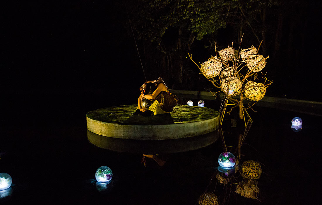 › Loreley, Hagen, Siegfried und die Nibelungen — der Rhein übt offenbar eine starke Anziehungskraft auf sagenumwobene Gestalten aus. In den Legenden ist sein Wasser mal ein Jungbrunnen, mal ein Ort der Verwandlung. Die einen finden ihr Schicksal in den Fluten, andere verstecken ihre Schätze darin. Wo, wenn nicht in Ludwigshafen, der selbsternannten „Stadt am Rhein“, muss man also damit rechnen, plötzlich einigen dieser merkwürdigen Wassergestalten zu begegnen? In diesem Sommer braucht man gar nicht erst lange das Ufer nach ihnen abzusuchen. Während des Internationalen Straßentheaterfestivals treiben sie sich nämlich praktischerweise mitten in der Innenstadt herum.Halb Wassergöttin, halb KröteVerantwortlich für das aufwendige Schauspiel ist das Theater Anu aus Berlin. Fünf Künstler werden den Ludwigshafener Europaplatz an den Abenden des 21. und 22. Juli 2017 mit einem märchenhaft-irrealen Stück über die mythische Kraft des Wassers bespielen. Die Inszenierung greift Motive aus dem „Froschkönig“ und anderen literarischen Texten mit ausgeprägter Wassersymbolik auf und überführt sie in fantasievolle neue Bilder. In einer Szene ist eine Wassergöttin zu sehen, die der Sagengestalt Undine ähnelt, aber auch etwas mit der garstigen Kröte aus dem Märchen der Brüder Grimm zu tun hat. Das Halbwesen in Menschengestalt bewacht eine Quelle und kommt dabei in den Besitz einer Silberkugel. Kaum hat die schöne Frau darin ihr Spiegelbild erblickt, verwandelt sie sich in ein Amphibium.Wassergöttin, Königssohn und nackte NympheFließende Übergänge zwischen Figuren, Räumen und Bedeutungen finden sich in der Theaterinstallation „Wasser. Mythen. Mensch.“ überall. Jede der fünf zeitgleich vorgeführten Performances dauert eine knappe Viertelstunde und wird ab Einbruch der Dämmerung loopartig wiederholt. „Die Nacht macht es leichter, sich der Inszenierung zu öffnen“, sagt Bille Behr, Spielleiterin beim Theater Anu. Mit ihrer Gruppe zeigt sie sich nicht nur häufig in der Dunkelheit, sondern vorzugsweise auch im Freien. Hier können die Gedanken der Zuschauer weiter schweifen als in einem herkömmlichen Theatersaal. Das ist wichtig, denn es braucht die eigene Fantasie, um sich auf die Zusammenhänge der surrealen Inszenierung einen Reim zu machen. Neben der Wassergöttin sind unter anderem ein Königssohn, eine Tänzerin und eine nackte Nymphe zu sehen.